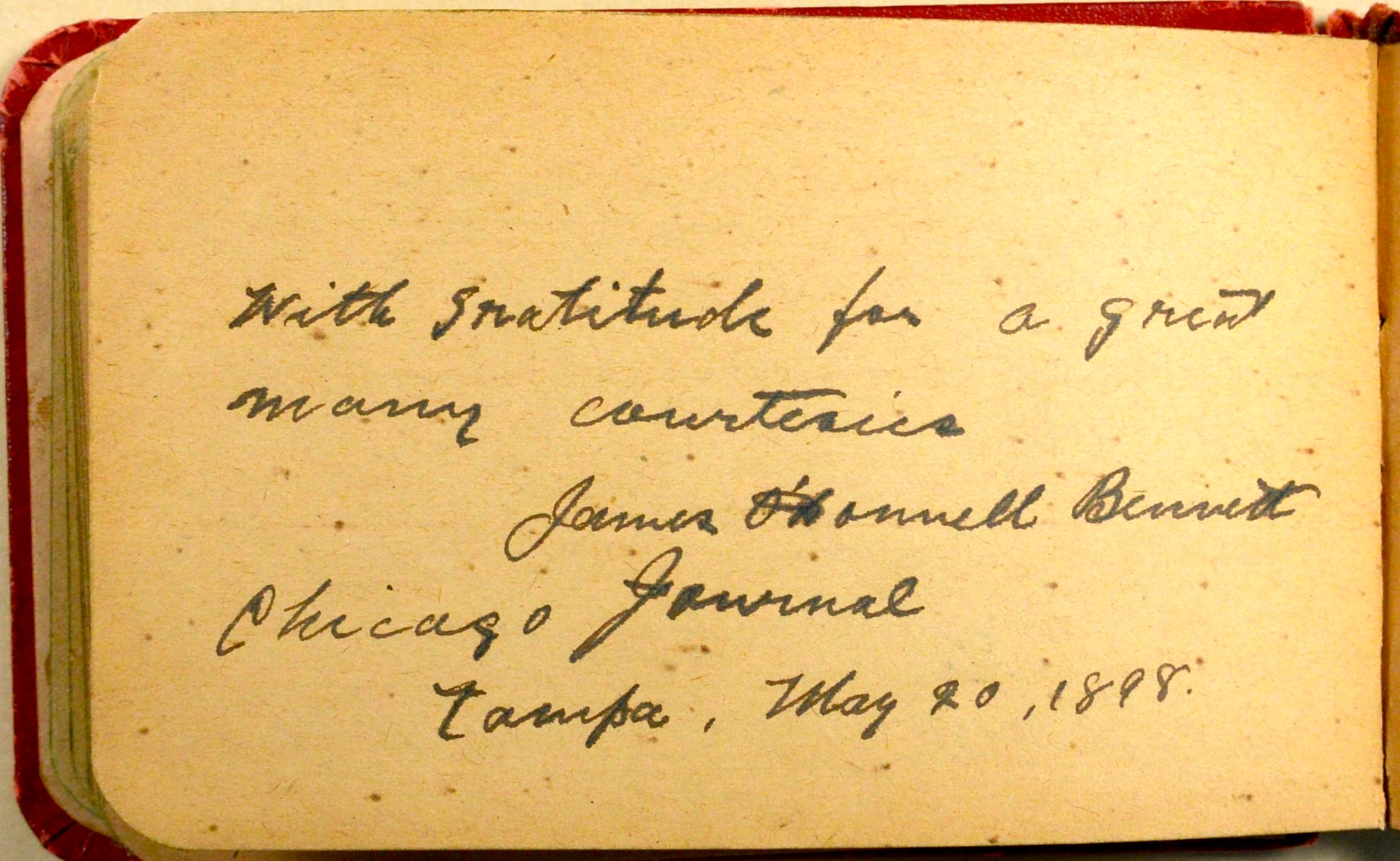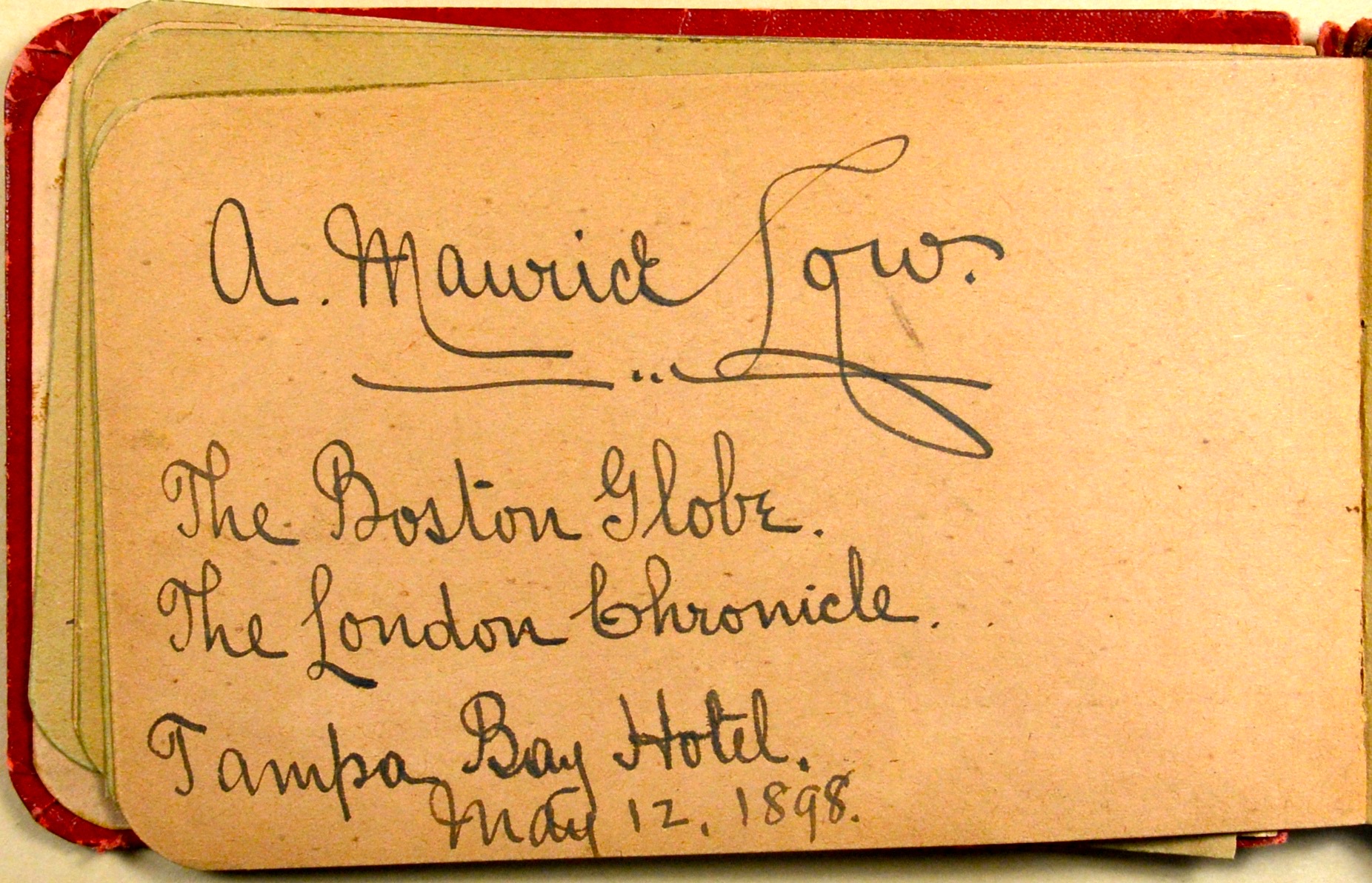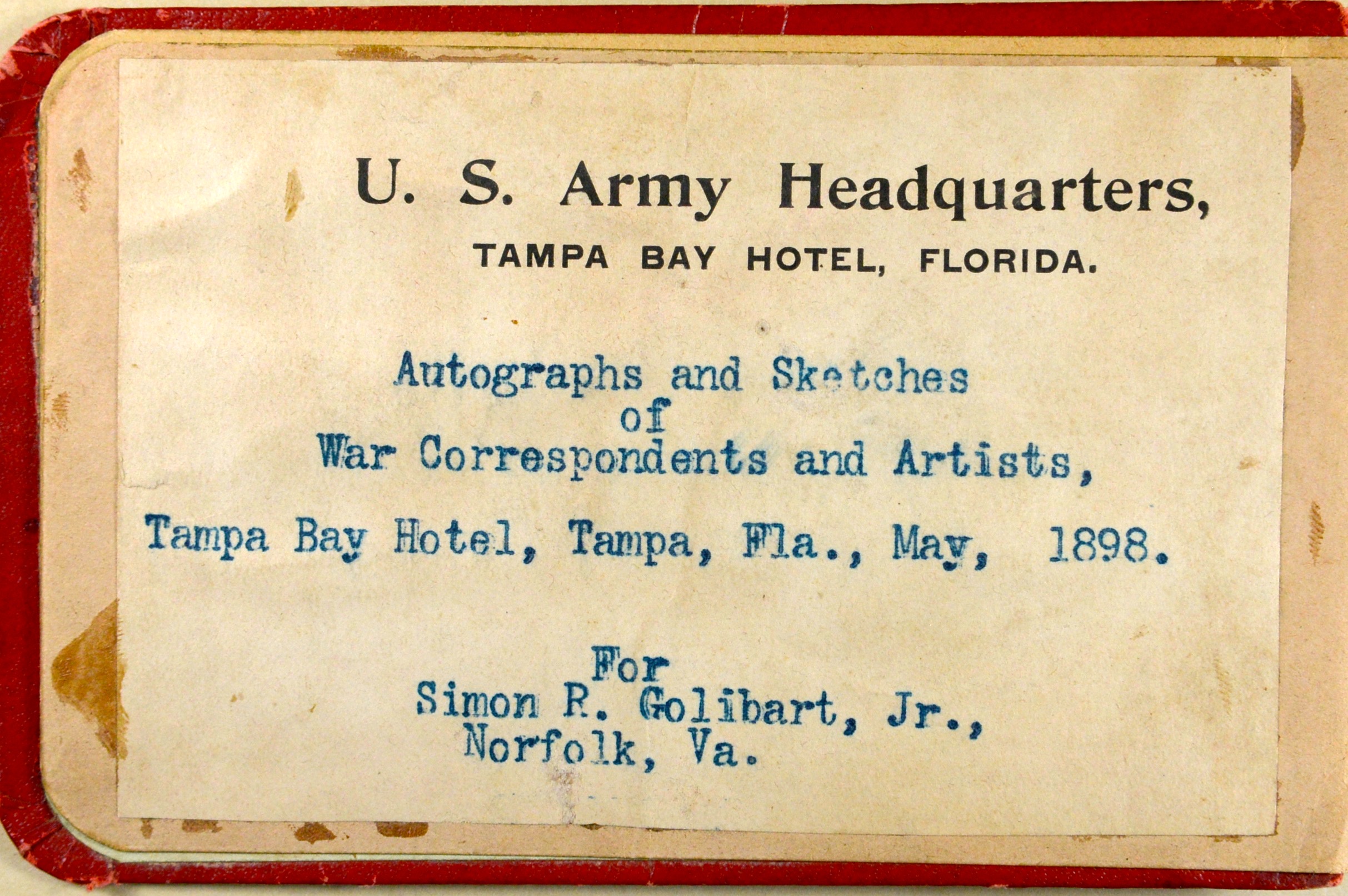 Recently exhibited in Stop the Presses: Fake News and the War of 1898, this autograph album was a guest at the Tampa Bay Hotel alongside Army generals, foreign attaches, war correspondents, and Red Cross nurses. The compiler of the album, Simon R. Golibart, perhaps intended it as a gift for his second son, then ten years old, Simon R. Golibart Jr.