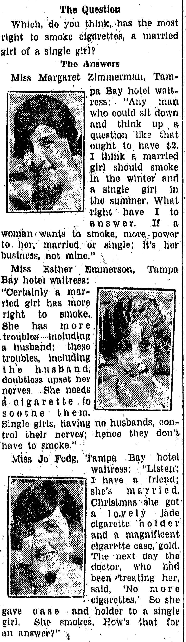 The employment of young, white women as waitresses, secretaries, and salesclerks constituted the largest sector of job growth in the United States between 1890 and 1930. Women wrestled with the mixed messages they received from parents, advertisers, and coworkers in the new mixed-sex workplace. Bobbed hair, shorter hemlines, and cigarette smoking were all signs of changing social mores. Waitresses found that they risked rebuke or even firing if they went too far, as Evelyn Bishop discovered when she wore pants in downtown Tampa.