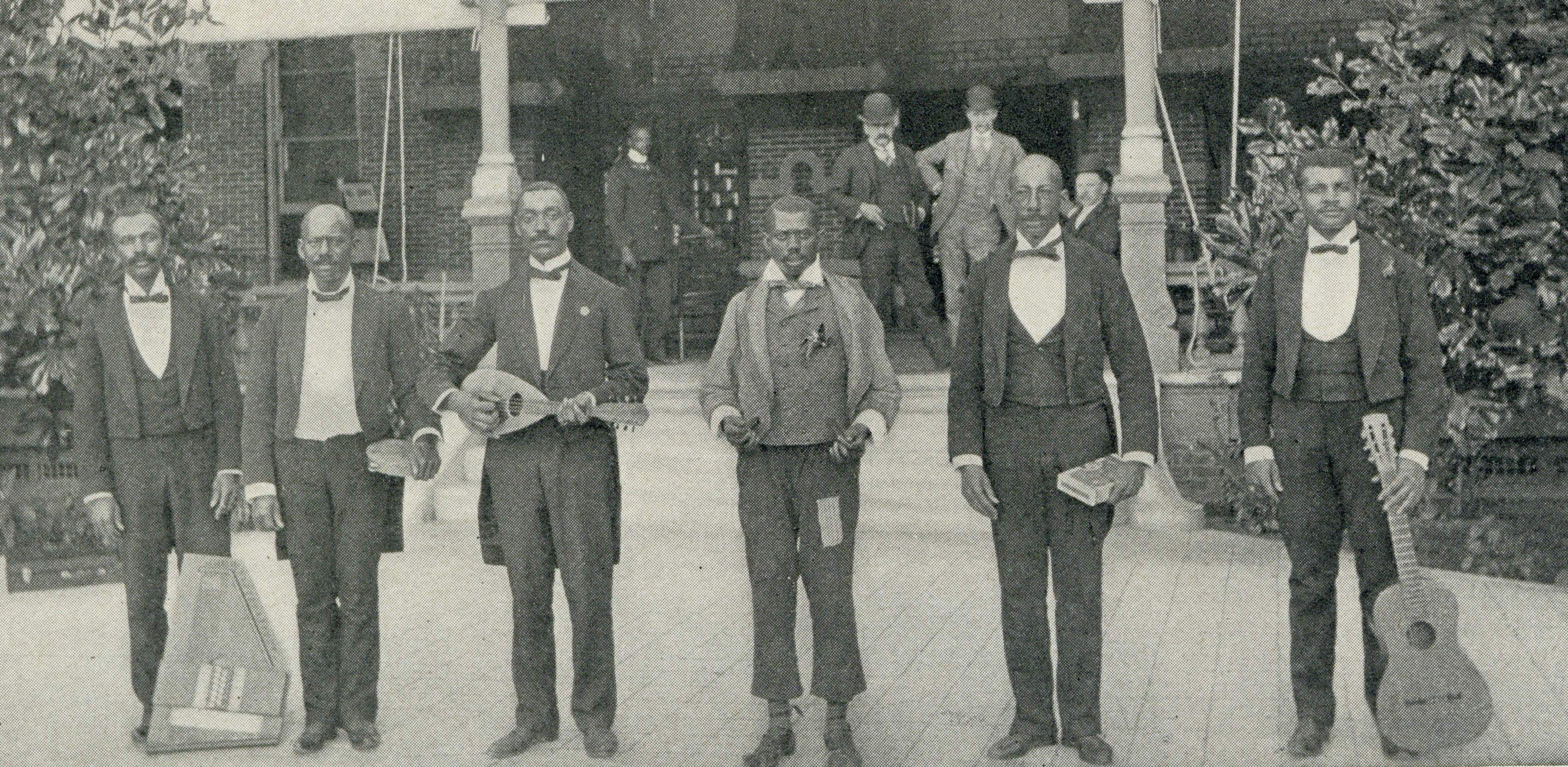 Pictured above, waiters performed as the “Tampa Bay Hotel Quartet,” one of the hotel’s most popular entertainment offerings throughout the 1890s. These productions showcased the singers’ vocal talents and mastery of contemporary standards, but the waiters were also forced to act out the racial stereotypes that characterized vaudeville minstrel shows. Whatever their own feelings about these representations, dining room workers used minstrel shows to raise funds for sick and elderly waiters.