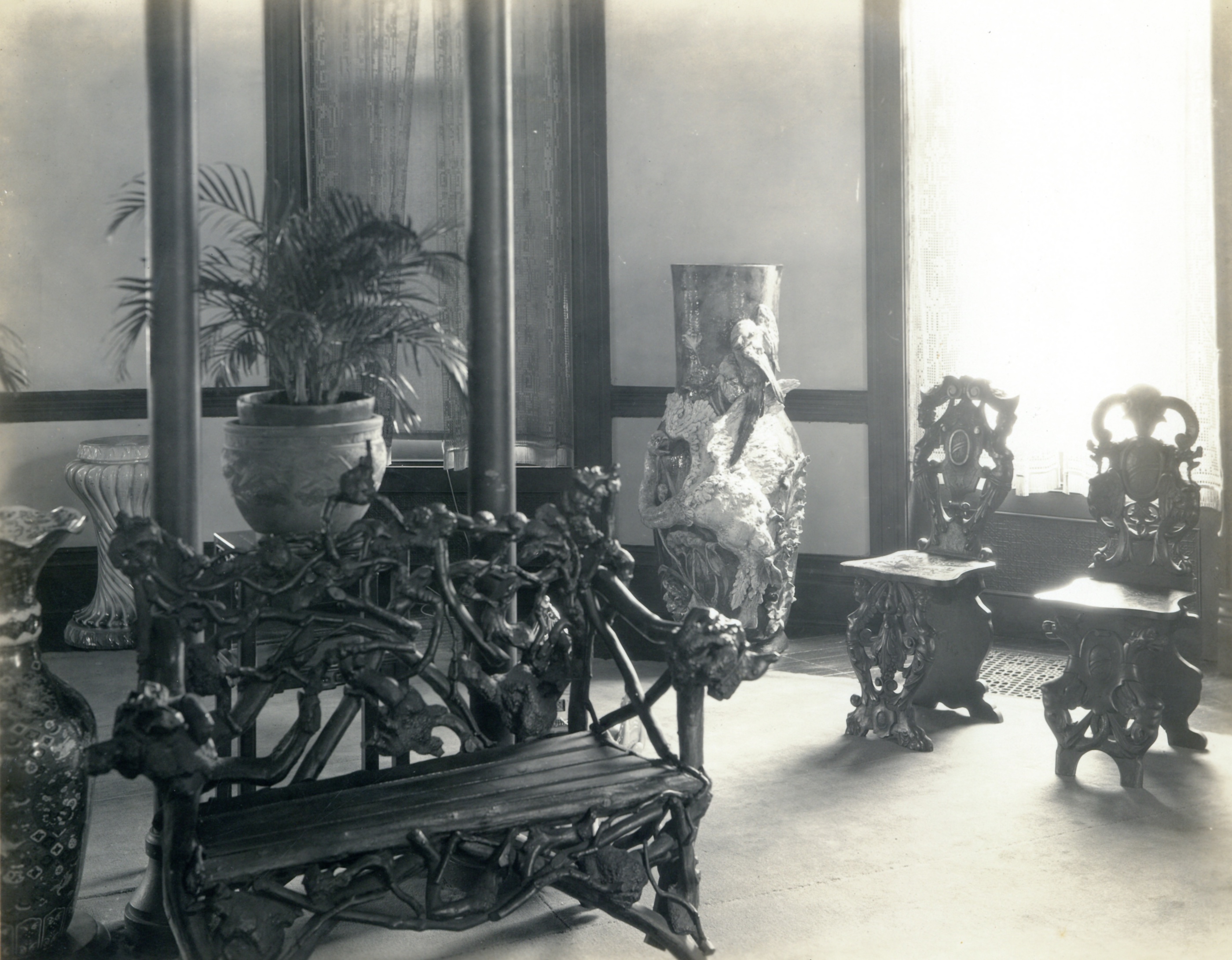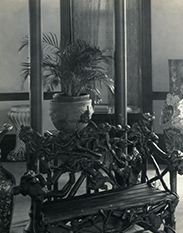 Rustic bench with Japanese influence made of intertwined briar branches forming back support, arms, and legs. Surface is irregular with rough textured roots and thorny nubs-stained with a dark finish. One of a pair originally pictured in the Tampa Bay Hotel solarium.