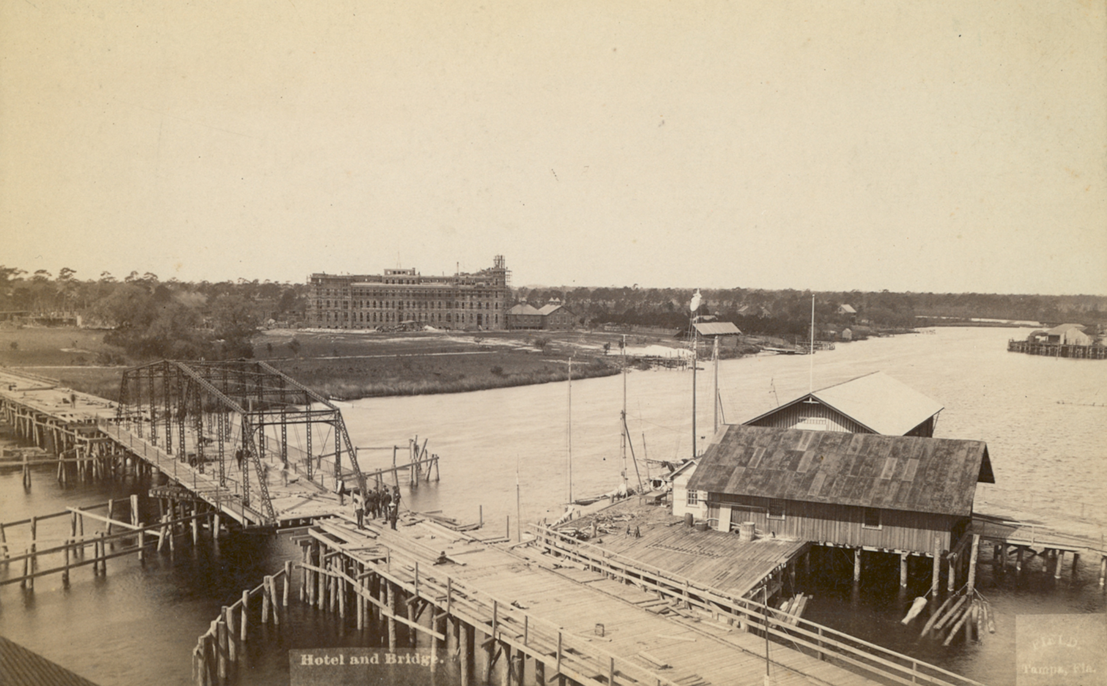 Prior to 1888, a ferry was the only means to cross the Hillsborough River. With the expectation of future development on the west side of the river, Plant agreed to build the hotel if the Tampa Board of Trade built a bridge spanning the waterway. This 1889 photograph by prominent photographer J. C. Field shows the original swing bridge and the hotel under construction.