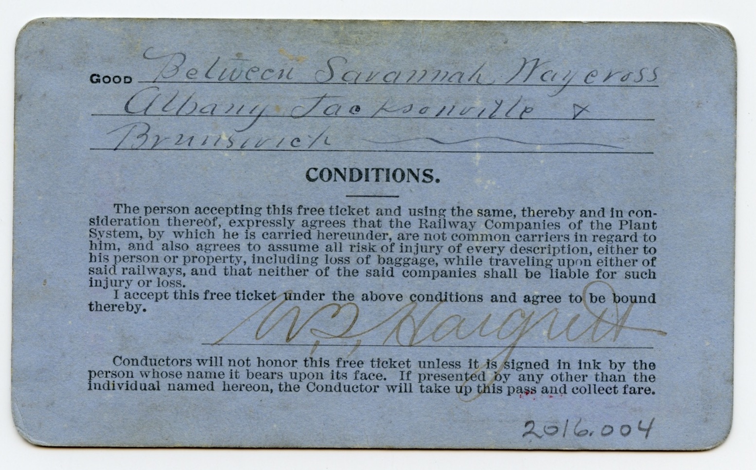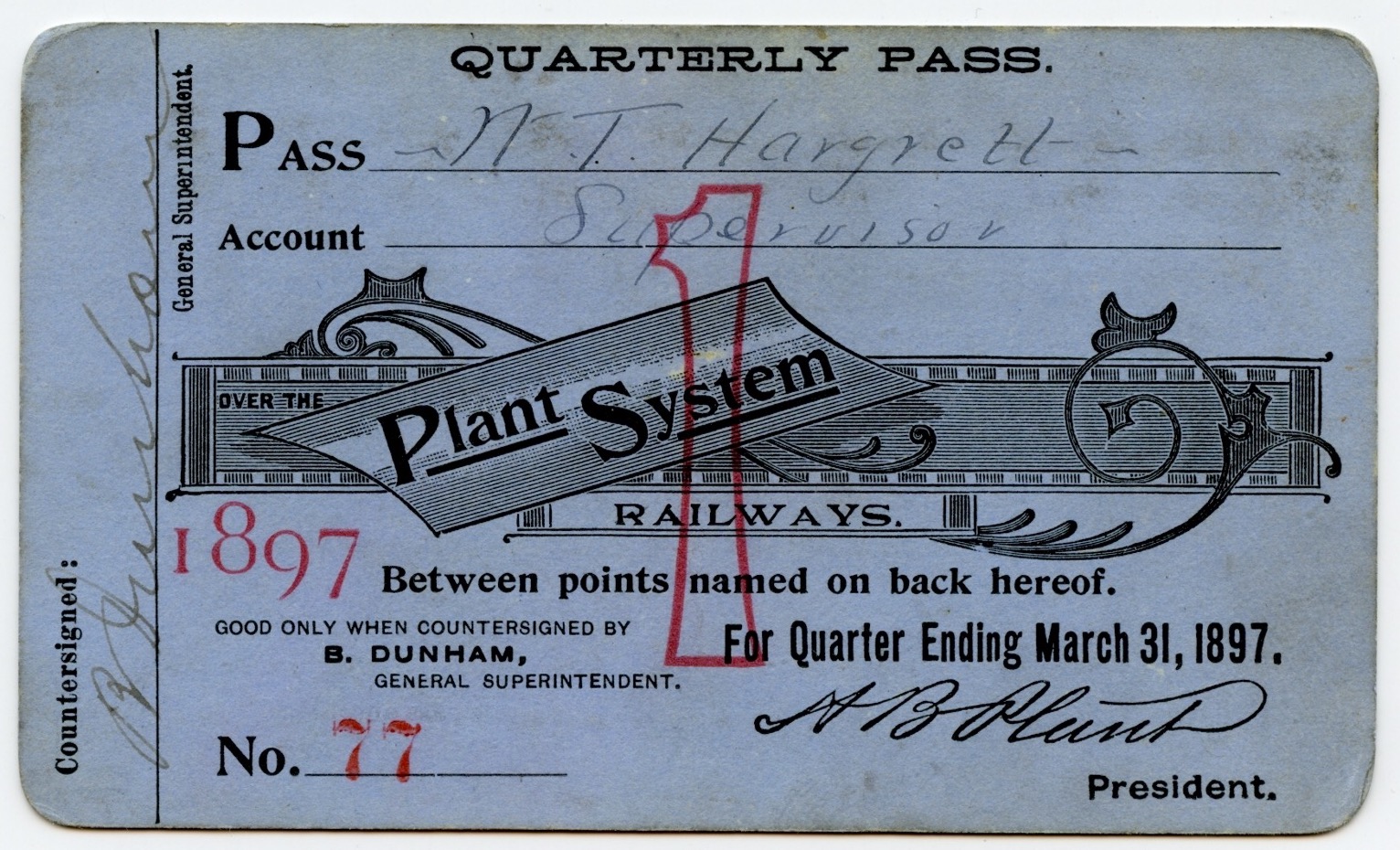 Plant System Railways Quarterly Pass No. 77 "for Quarter ending March 31, 1897" signed by H.B. Plant, President. Name handwritten in ink is "N.T. Hargrett" and the Account is "Supervisor." The pass was good "between points named on back hereof". Those points were handwritten as "Belleview, Savannah, Waycross, Albany, Jacksonville, and Brunswick." The recipient of the pass had to agree in writing to printed conditions absolving the Plant System should he experience injury to his person or property.