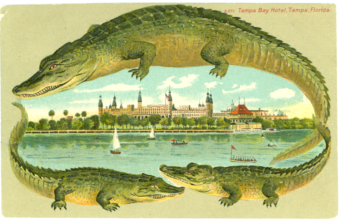 Alligator border postcard of the Tampa Bay Hotel, view from the east side of the river overlooking hotel and boathouse, electric boat launches, sail boats, all surrounded by alligators - one large on top, two smaller facing each other at bottom, tails and snout framing the hotel/river scene. Postmarked June 16, 1908. Numbered S571.