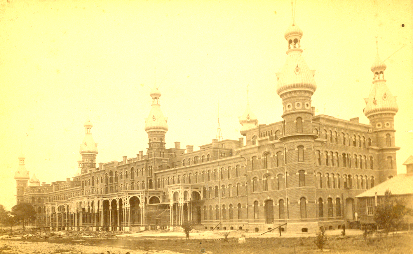 This photograph by J. C. Field shows the hotel before Plant amended the architectural plans to add the solarium and dining room at the north end of the building, for a total of six to eight acres of floor space. This unobstructed view reveals the prevalence of the horseshoe arch motif in all 735 windows. To maintain the continuity between the exterior and interior spaces, these arches are also present in the interior hallway arches.
