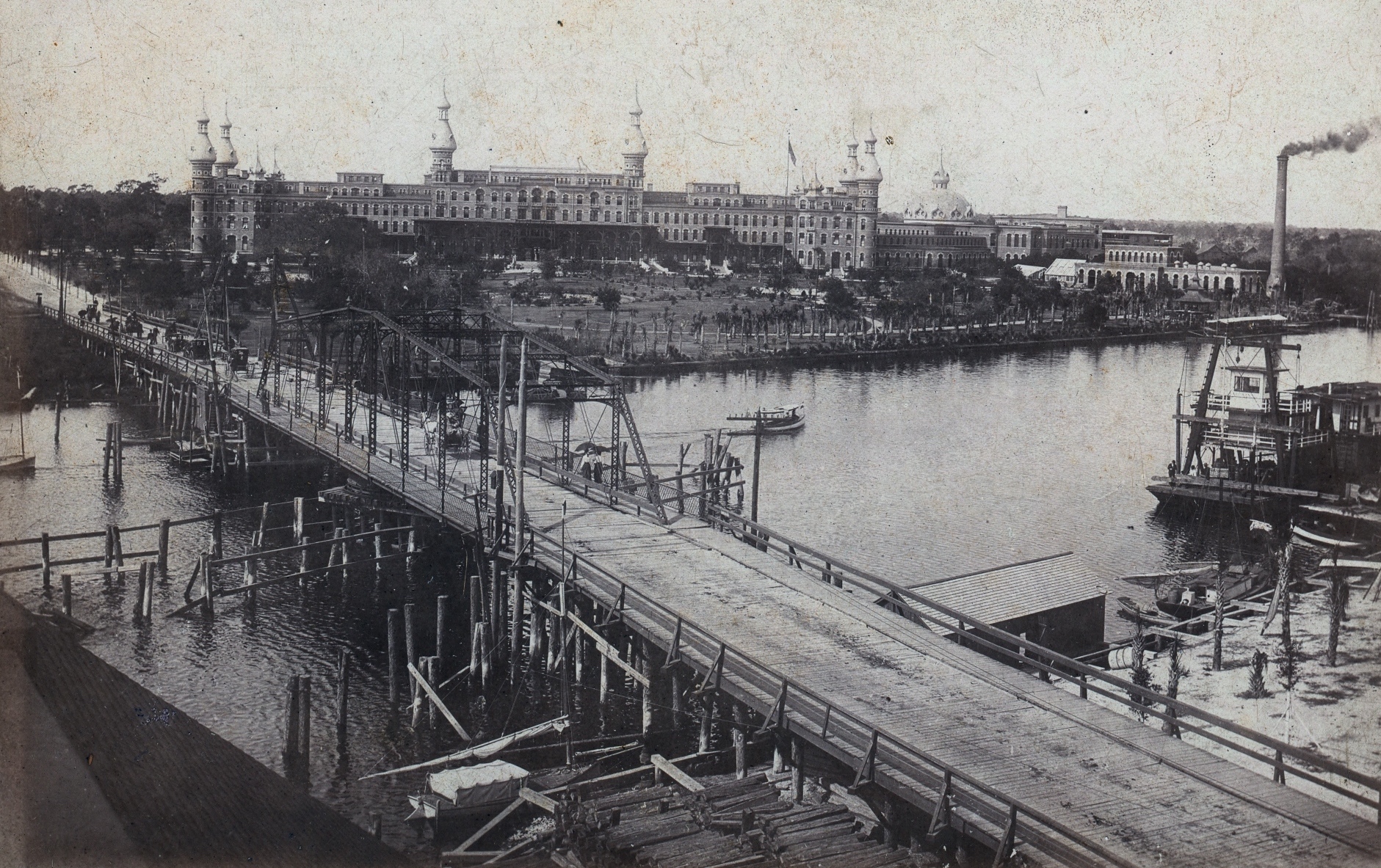 The original Lafayette Street (today Kennedy Boulevard) swing bridge opened on November 28, 1888. A designated pedestrian path is on both edges of the bridge. This civic improvement is one of Plant’s lasting legacies. The power plant that he built, identified by its 140-foot tall smokestack, provided electricity for the hotel.