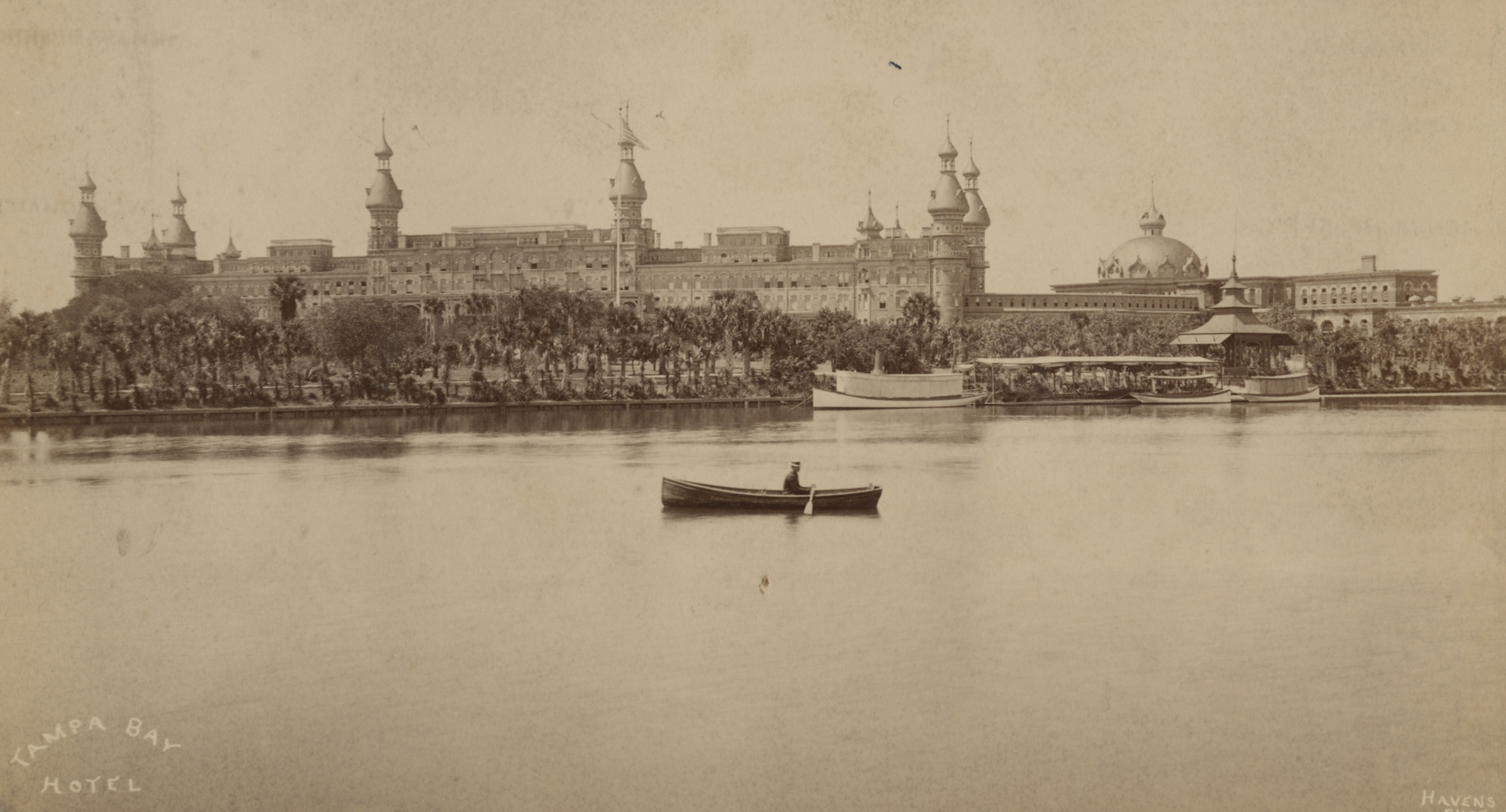 The hydriotic esplanade, designed like a pagoda, is visible along the riverbank. Guests viewed the river, aquatic life, and boaters from this unusual structure. When the Tampa Weekly Tribune newspaper reported on the property inventory in 1905, the hydriotic esplanade was among the 27 buildings on the grounds. This photograph was taken by O. Pierre Havens, a prominent photographer from Jacksonville.