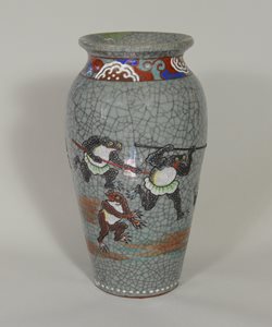 A classically-shaped folk pottery vase with a large crackle surface. This has designs of playful frogs in a landscape setting.